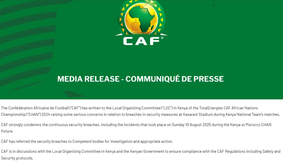 SPORTS CAF strongly condemns security breaches at Kasarani Stadium during Kenya National Team matches ngasumediaAugust 12, 2025August 12, 2025 Share this story Share this story
