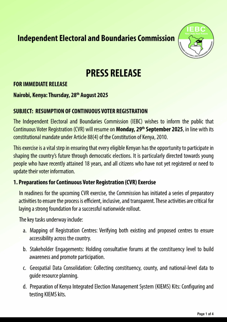 The Independent Electoral and Boundaries Commission (IEBC) has confirmed that Continuous Voter Registration (CVR) will resume on Monday, September 29, 2025. The announcement was made in line with the commission’s constitutional mandate under Article 88(4) of the Constitution of Kenya, 2010.