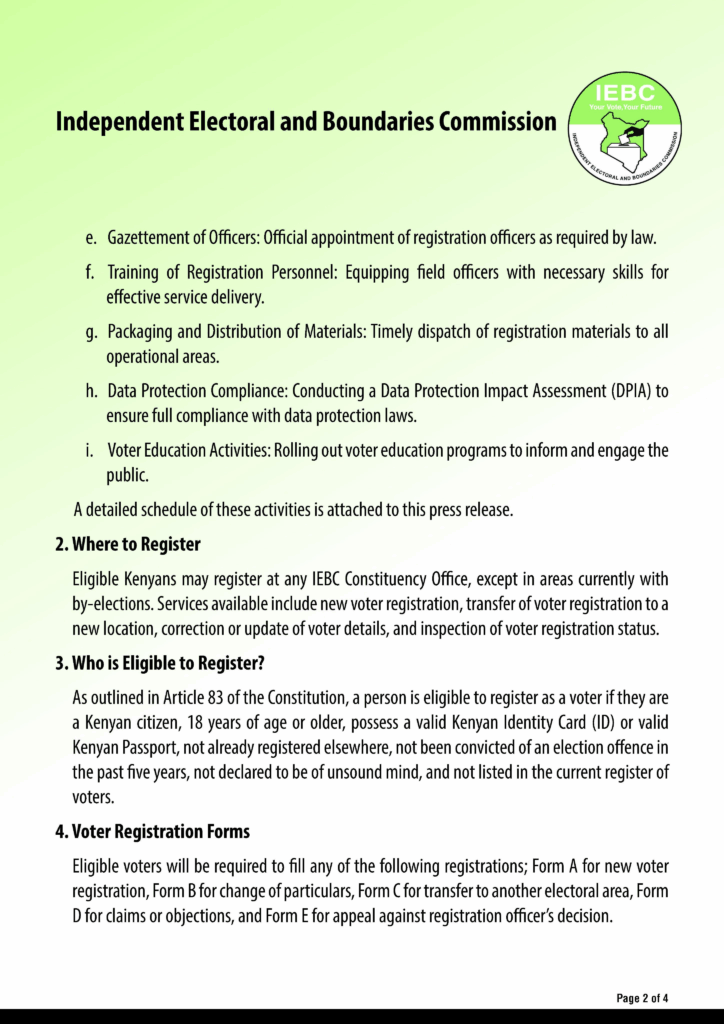 According to the IEBC, the exercise will primarily target individuals who have recently turned 18, as well as citizens who were previously not registered. Voters who need to update their information will also be required to participate in the registration exercise.