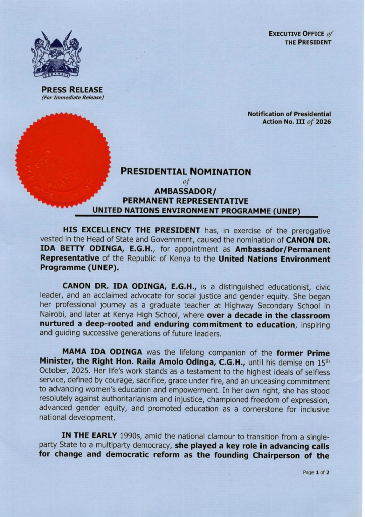 President William Ruto has nominated Ida Betty Odinga, the wife of former Prime Minister Raila Odinga, as Kenya’s Ambassador and Permanent Representative to the United Nations Environment Programme (UNEP).